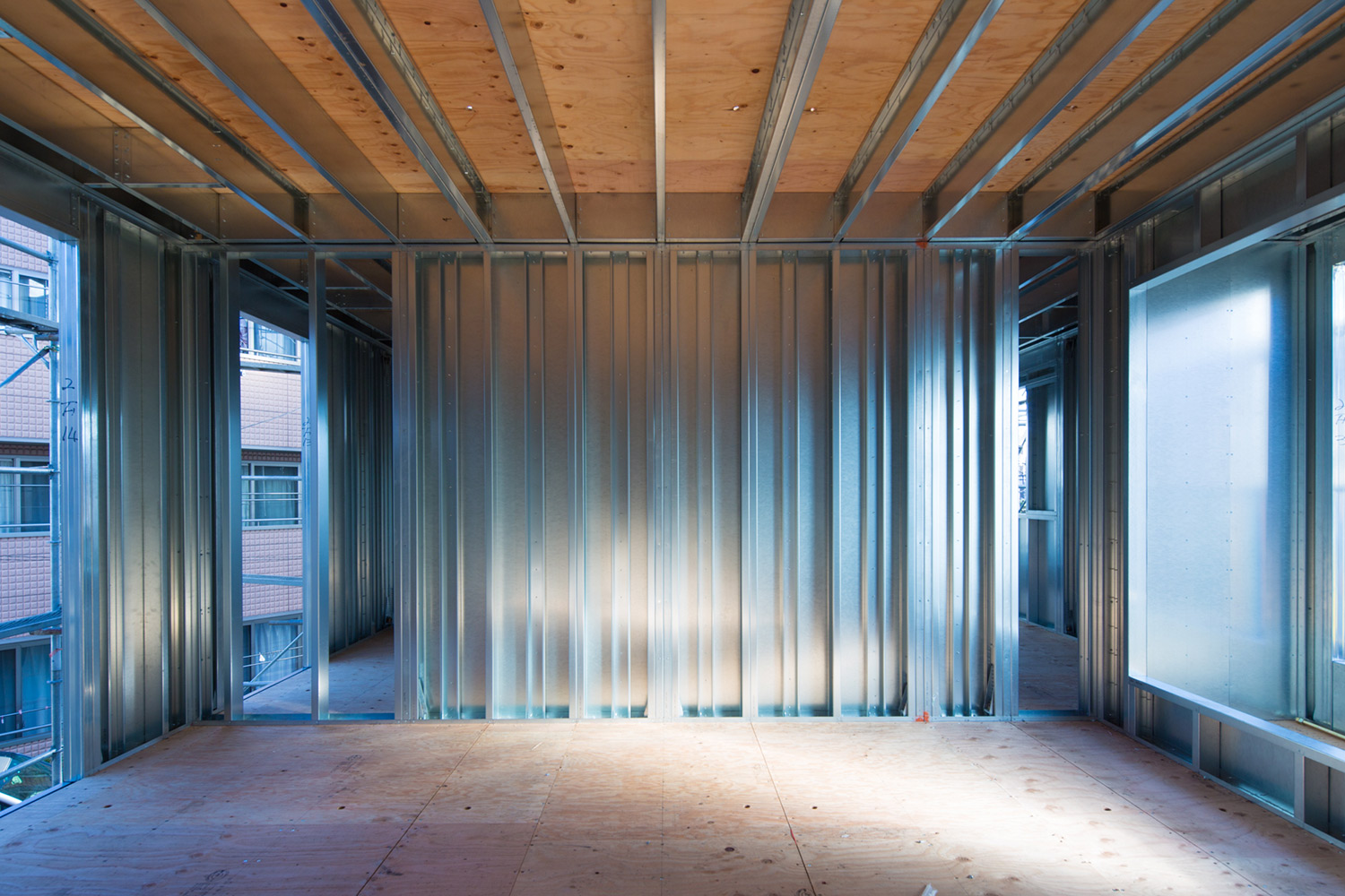 木材2×4工法に用いられる枠材を、厚さ1mm前後の鉄に置き換えた鉄骨CFS工法。